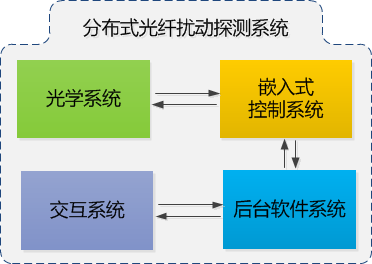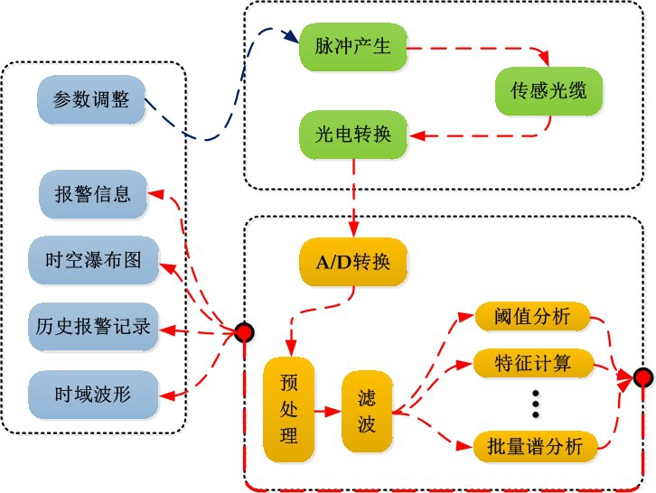 光學系統產生極窄線寬、功率適當的探測脈沖,將探測脈沖注入傳感光纖并同時接收傳感光纖中返回的瑞利后向散射光,進行光電轉換,提供原始的擾動傳感信號。嵌入式控制系統和后臺軟件系統對傳感數據進行存儲、處理、計算、傳輸、交互。嵌入式控制系統通過數據采集設備將光探測器輸出的模擬擾動傳感信號轉換為數字信號,交付后臺軟件系統進行實時處理。后臺軟件系統讀取傳感數據后,進行預處理、濾波、批量 FFT 分析、特征量計算、閾值分析等,提供擾動數據的處理結果。交互系統將后臺軟件系統的處理結果實時顯示給用戶查看,包括報警信息、擾動曲線、時域波形、時空瀑布圖、調閱歷史報警記錄、查看歷史波形等功能,并可根據用戶的輸入,對系統的空間分辨率、脈沖重復頻率、探測脈沖寬度等參數進行適當調整。