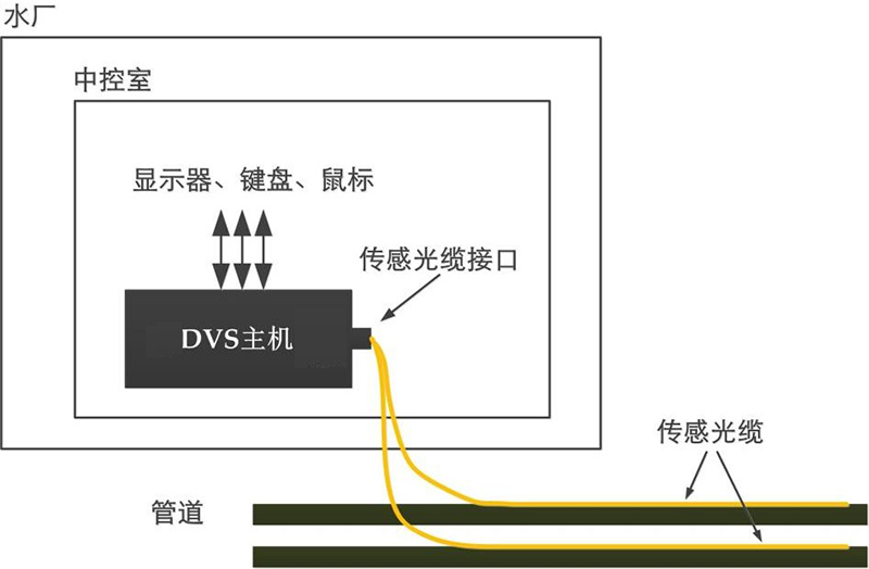 在水廠的中控室(或類似設備間)內放置 DVS 主機,并連接顯示器、鍵盤、鼠標, 供給 220V AC 市電,開機使其正常運行。將沿管壁貼敷的傳感光纜從地下管道處引入水廠內、導入中控室中,選取光纜中的一芯熔接 FC/APC 跳線后,插入 DVS 主機的傳感光纜接口。運行 DVS 泄漏在線監測軟件,系統正常運行,可實時在線監測管線各處的泄漏情況。