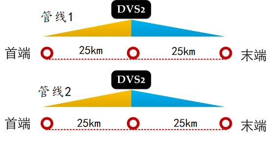 具體,可采用兩套雙通道 DVS 系統從中間向兩邊輻射實現 50km 的雙管線全覆蓋監測。為降低系統建設成本,可將兩條管道全部安裝光纖傳感器,兩套傳感器共用一套DVS系統,進行分時測量,即同一時間只能監測一條管線,管線1和管線2輪流監測。